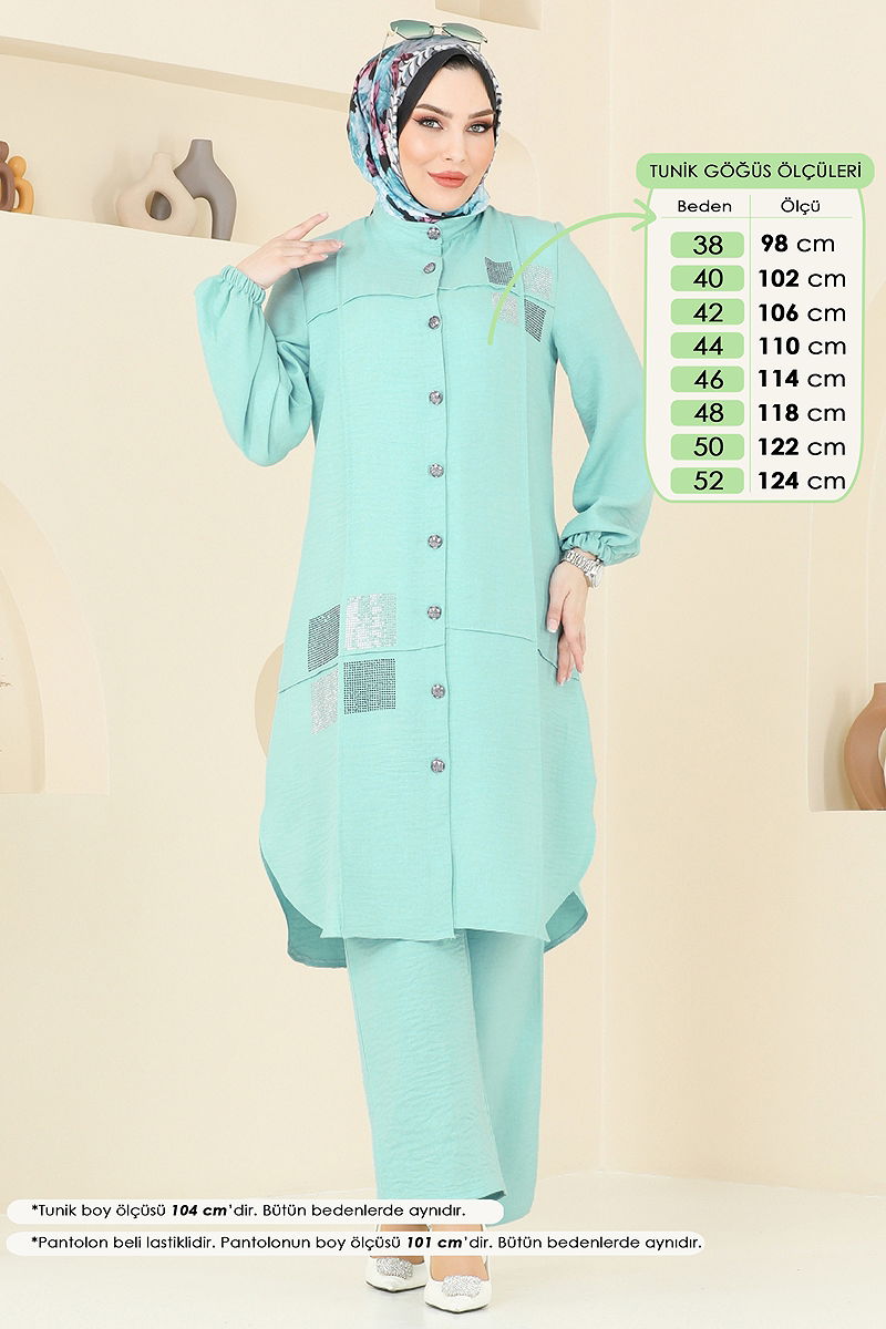 The Stone Detail Linen Suit is a modest wear that can be comfortably used in all seasons. It can be washed gently at 30 degrees. Manufactured from high-quality Sofia Linen fabric, it offers a comfortable fit. The tunic, which has a half stand-up collar, gains a modern look with side slit details. The elastic waistband of the pants and the elastic cuffs of the tunic provide a comfortable fit. The tunic is unlined, and the stones are stick-on. This stylish and practical modest suit will become an indispensable part of your wardrobe.
