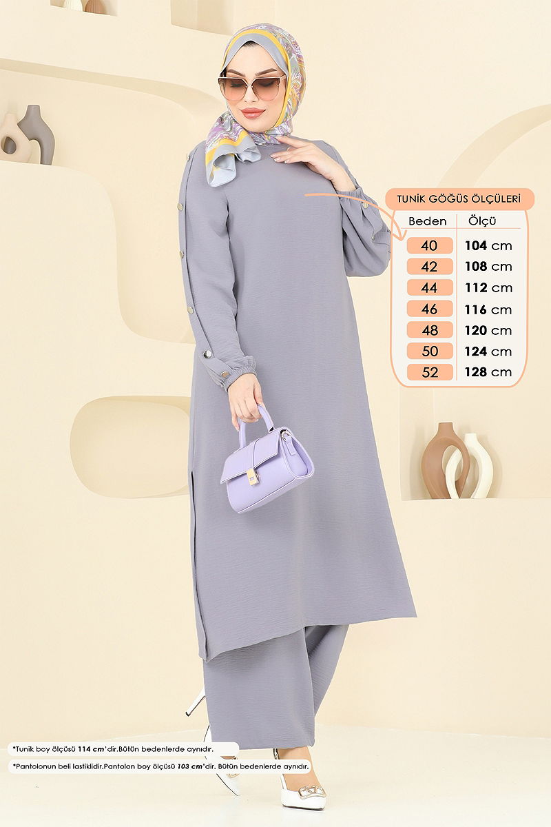 The Apolet Buttoned Hijab Suit is a hijab clothing item that stands out for its all-season comfort. Made from aerobin fabric, this special design is suitable for gentle wash at 30 degrees and offers long-lasting use. With its crew neck and unlined structure, it has a modern look, while the button detail at the back provides practical usage. The elastic waist and cuffs of the pants ensure a comfortable fit. Offering both elegance and comfort, this suit allows you to create a stylish style in any setting.