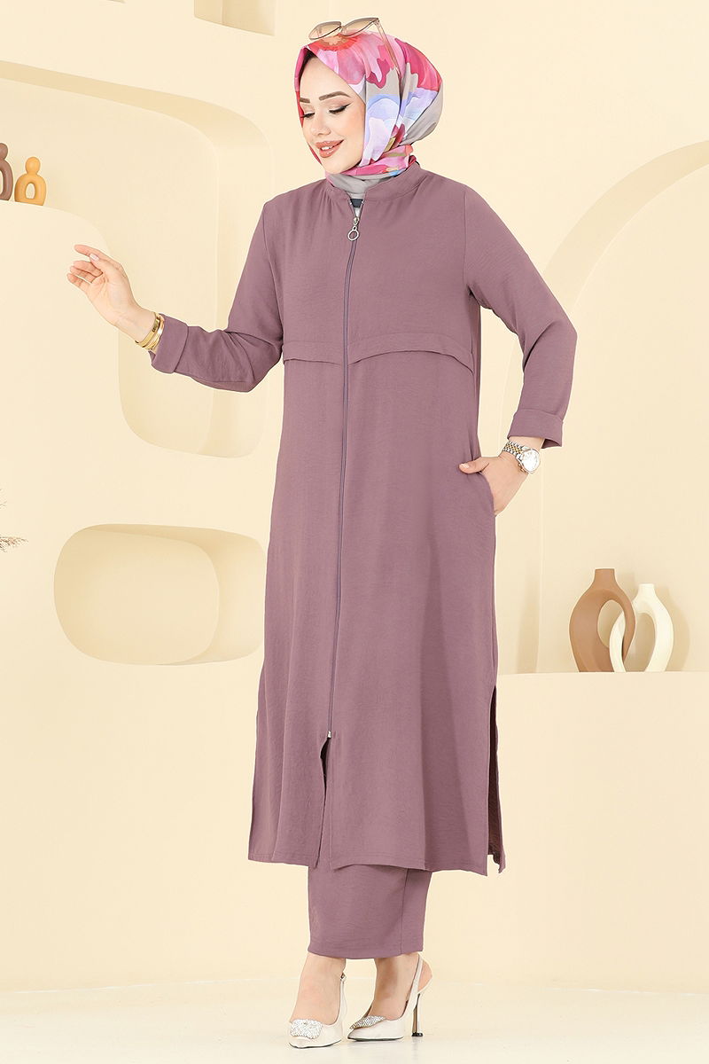 The Front Zippered Hijab Suit from the collection offers comfort and elegance throughout all seasons. Designed for gentle wash at 30 degrees, this suit is made from breathable aerobin fabric. It features a semi-mandarin collar and a slit for a modern look, while its unlined structure ensures lightness and comfort. The front zipper detail and elastic waistband on the trousers allow for practical use. Convenient pockets are also included in the trousers. Suitable for both everyday and special occasions, this suit stands out with its functional details.