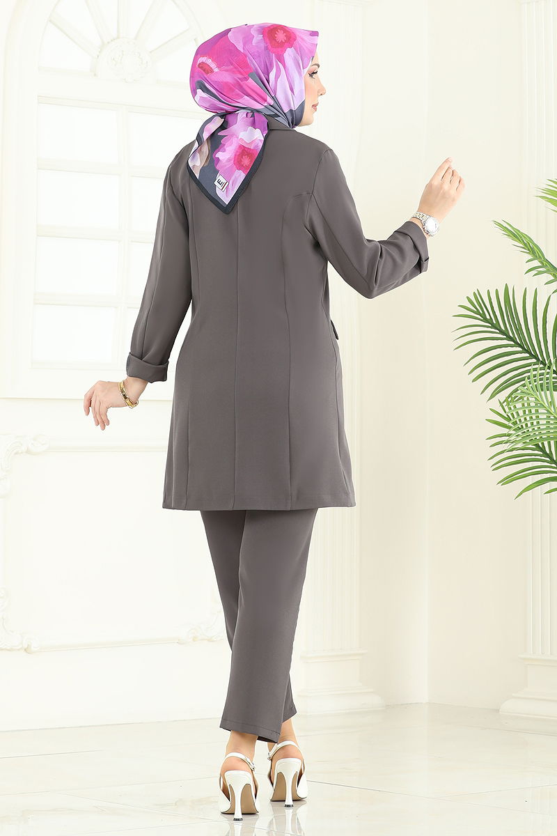 The Blazer Jacket Hijab Set offers elegance that can be comfortably used in all four seasons. Made from Double Crepe fabric, this set can be washed at 30 degrees with gentle care. The jacket with a lapel collar and button-up front prioritizes comfort with its lining-free design. The trousers' elastic waist and slit detail provide freedom of movement. This set is practically stylish and perfect for use throughout the year. Note: The model in the product wears a size 38 and accessories are not included.