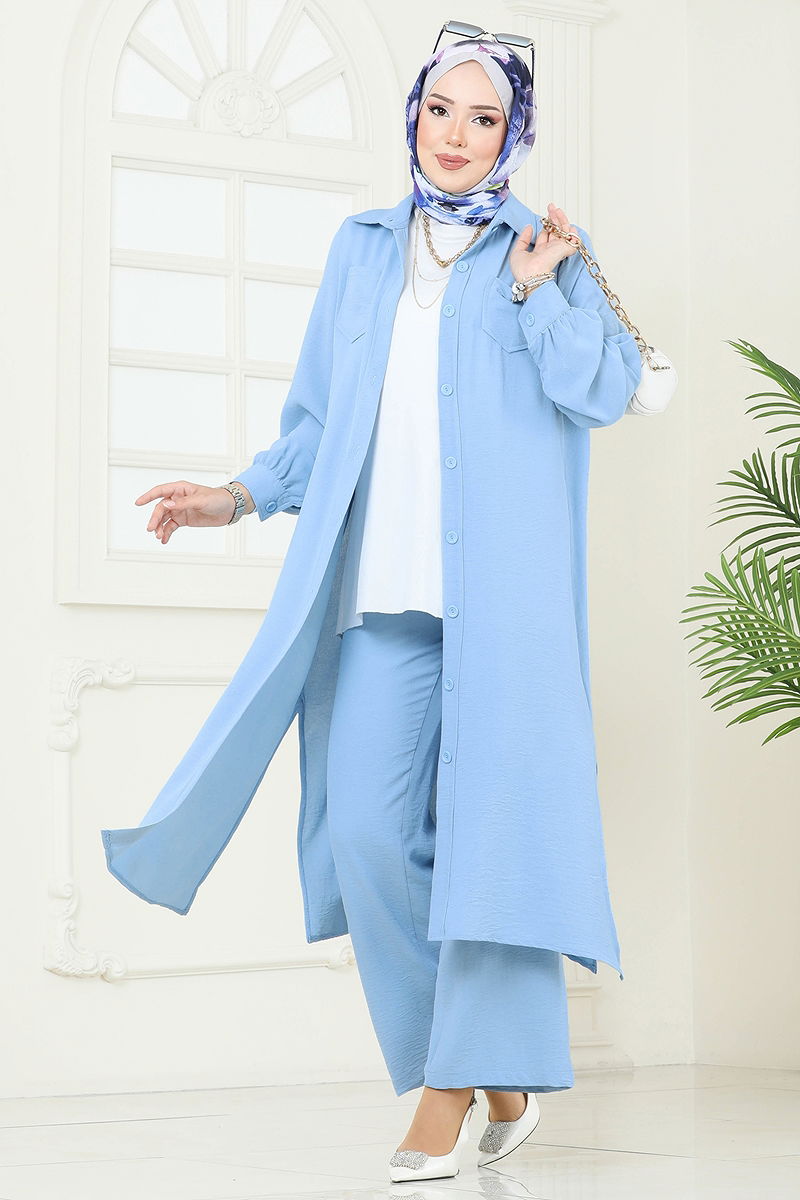 The Pocket Detailed Aerobin Set is a modest fashion piece suitable for all seasons. It can be washed at 30 degrees with gentle care. Made from aerobin fabric, it features a shirt collar and front buttons, making it stylish and functional. The tunic is side-slit and unlined for comfort, while the pants have an elastic waist for ease of wear. The breast pocket is functional and the cuffs feature buttons for added detail.