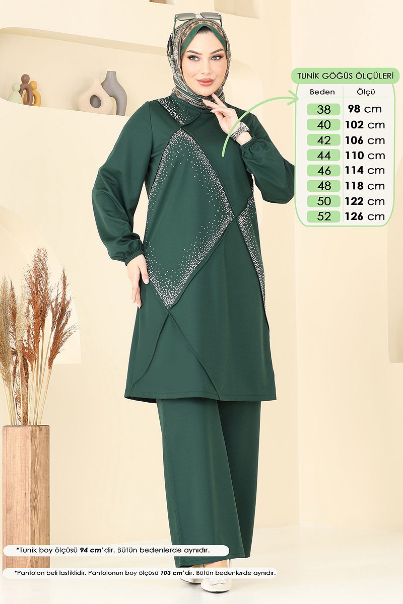 Showcase your elegance all year round with the Stone Detailed Hijab Suit . This elegant choice, which can be easily cleaned with its 30-degree gentle wash feature, is produced from durable dabıl fabric. The bicycle neckline and lining-free design prioritize comfort. Its elastic cuffs on both the tunic and trousers provide a comfortable fit. The product is sized 38 and offers practical use with a back button detail.