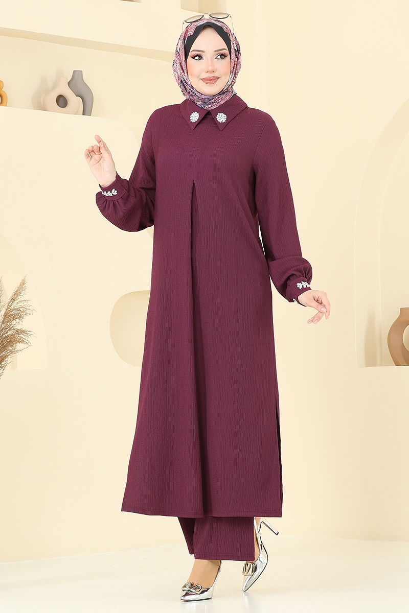 Product Feature : It is a new season hijab fashion product. The product is worn on the head. It has a button that can be used from the back. The product has a Shirt collar. The tunic has a side slash.. Unlined. The stones are glued. The waist of the trousers is elastic. There may be a tonal difference in the product due to concept photo shoots.