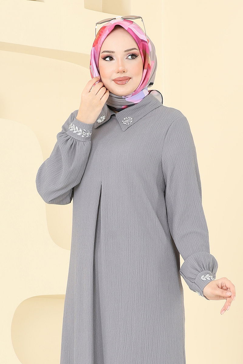 Product Feature : It is a new season hijab fashion product. The product is worn on the head. It has a button that can be used from the back. The product has a Shirt collar. The tunic has a side slash.. Unlined. The stones are glued. The waist of the trousers is elastic. There may be a tonal difference in the product due to concept photo shoots.