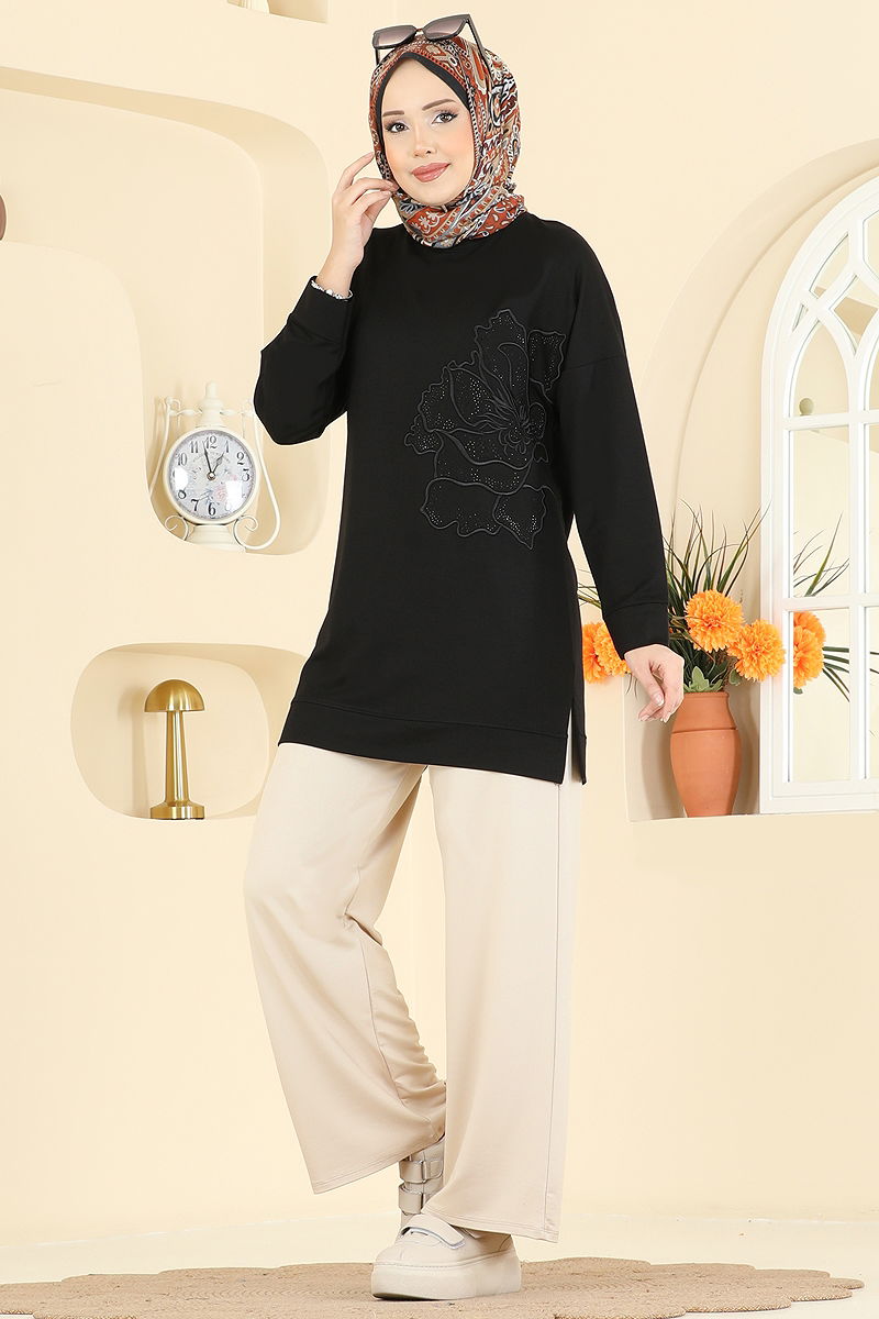 Product Feature : It is a new season hijab fashion product. The product has a Cycling collar. The tunic has a side slash.. Unlined. The embroidery details are sewn and the stones are glued. The waist of the trousers is elastic. There may be a tonal difference in the product due to concept photo shoots.