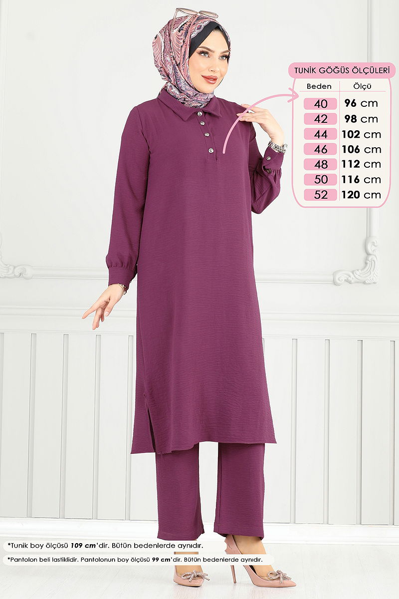Enhance your modest elegance with the Half-Buttoned Aerobin Suit , designed for comfort in all seasons. This easy-care ensemble can be washed at 30 degrees on a gentle cycle. The tunic features a shirt collar and half-button front, supplemented by a pair of stylishly slit trousers. Its elastic waist ensures comfort throughout the day. Perfect for both everyday wear and special occasions, this hijab suit will become an essential part of your wardrobe.