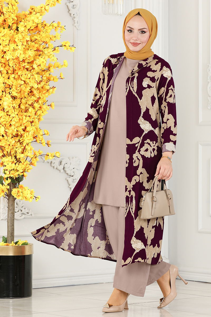 Elegant and stylish, the Patterned Triple Viscose Set is an ideal choice for your modest outfits throughout all seasons. Made from viscose fabric, this set should be hand-washed. It features a hooded collar and a button-up back, offering a modern look. The inner tunic is sleeveless and the hood is attached to the product. The pants have an elastic waistband for comfortable wear. Accessories are not included. This set combines comfort and elegance, ensuring you stand out in any setting.