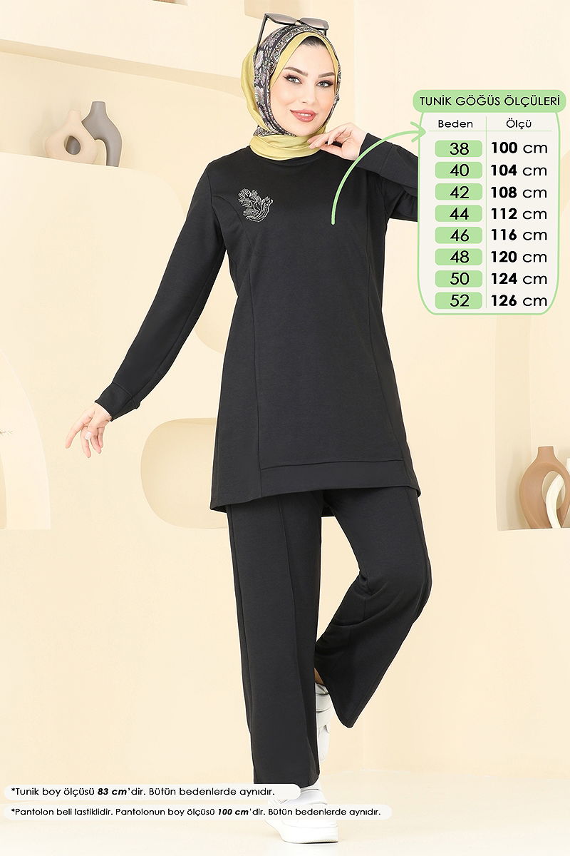 The Stone-Detailed Hijab Suit, offering both elegance and comfort, is a refined choice that you can enjoy throughout the four seasons. Made from double-thread fabric, this set can be washed at 30 degrees with gentle care. The tunic with a bicycle collar adorned with stone details and the elastic waist trousers ensure comfort all day long. Its lining-free design offers light and comfortable wear.