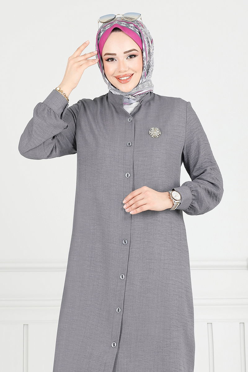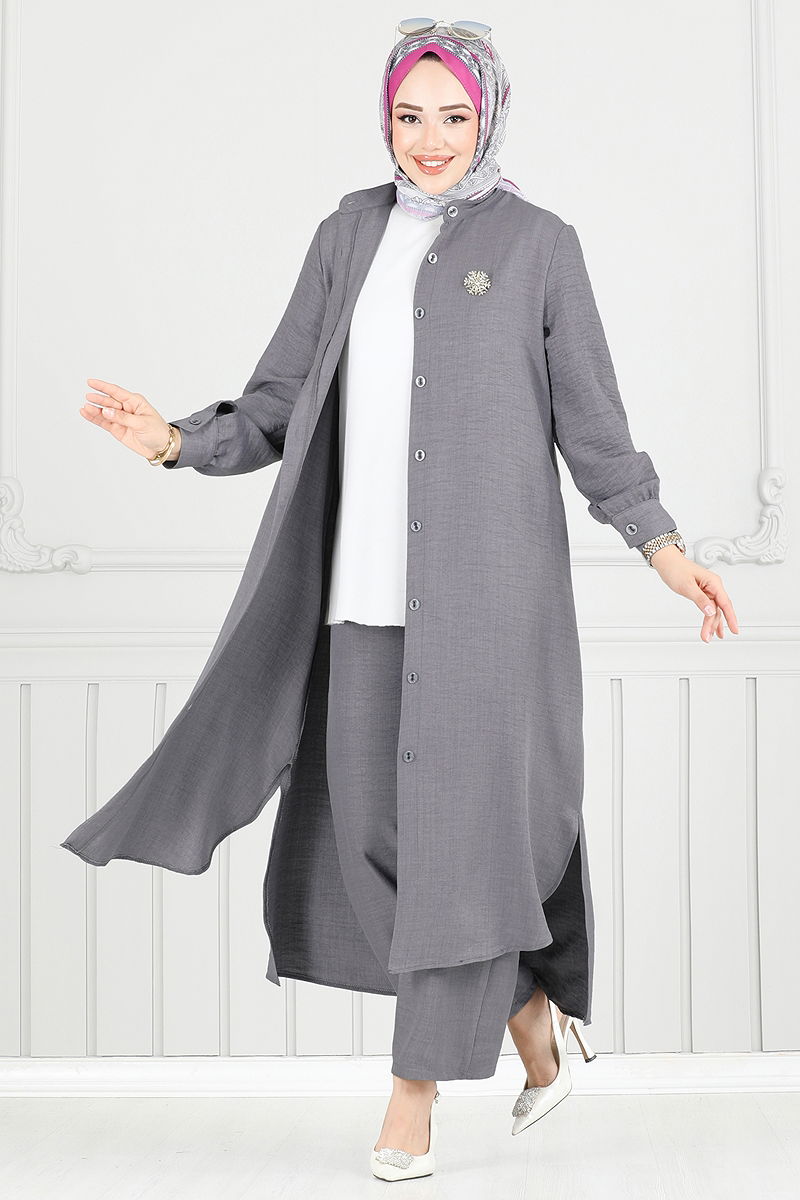 Product Feature : It is a new season hijab fashion product. The product has a Half Judge collar. The product has From the front buttons. The tunic has a side slash.. Unlined. Accessories are not included. Blouse is not included. Sample combination is made with the blouse to show the intended use of the product. The waist of the trousers is elastic. Cuff buttons are active. There may be a tonal difference in the product due to concept photo shoots.