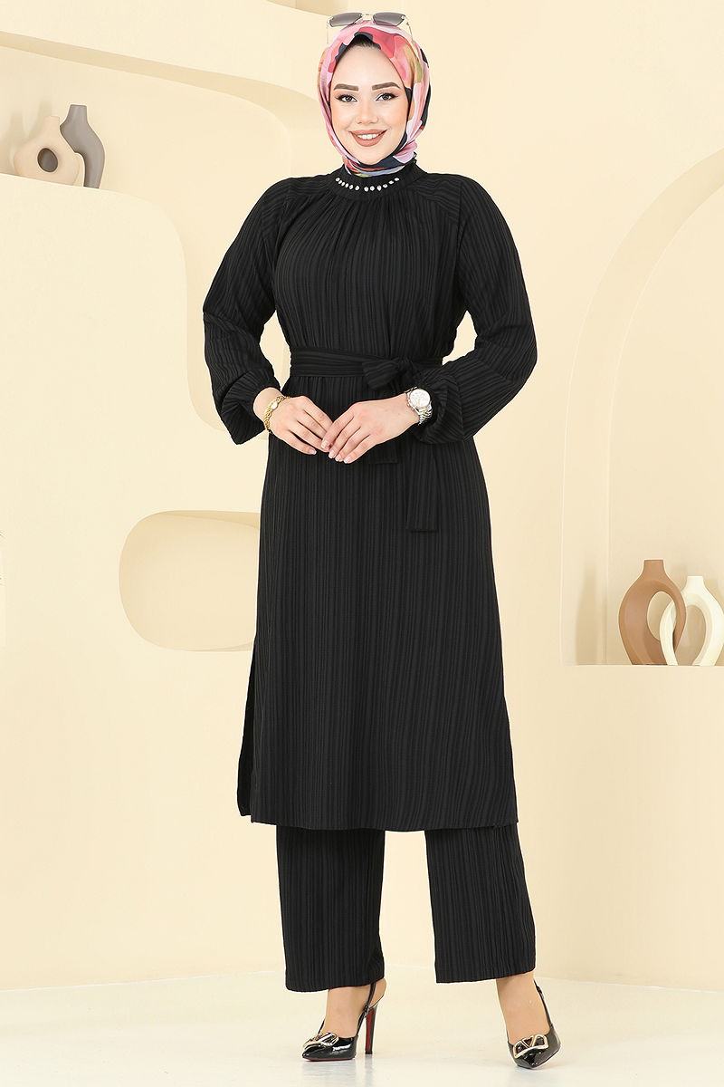 يوجد زر يمكن استخدامه من الخلف. يتم ارتداء المنتج على الرأس. المنتج لديه ياقة بيضوية. البلوز تحتوي على فتحة. غير مبطنة. التفاصيل الحجرية محفورة. الحزام متضمن، ،يمكن استخدامها حسب الرغبة خصر البنطال مرن. السوار مطاطي. قد يكون هناك اختلاف في الدرجة اللونية في المنتج بسبب التقاط الصور الفوتوغرافية.