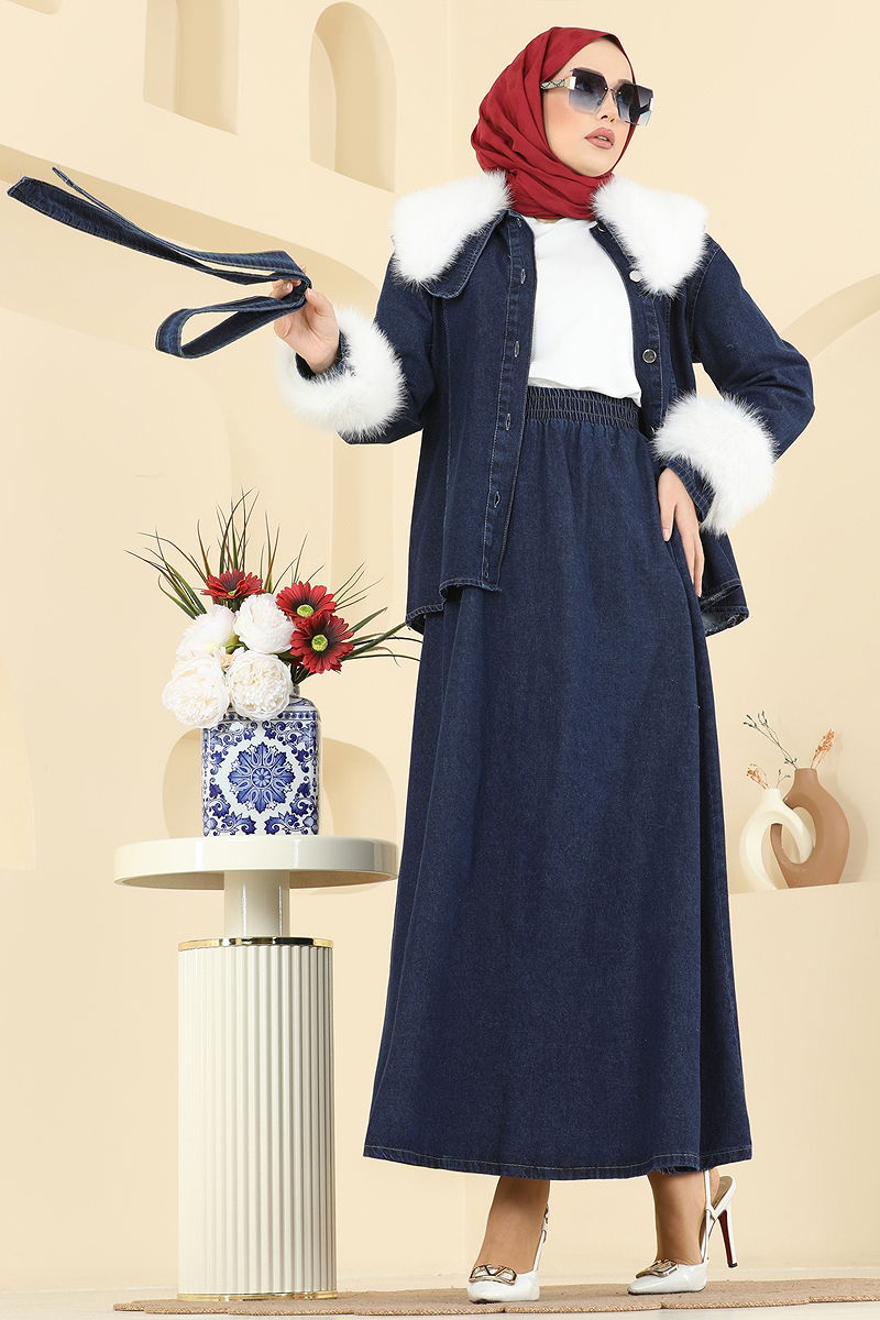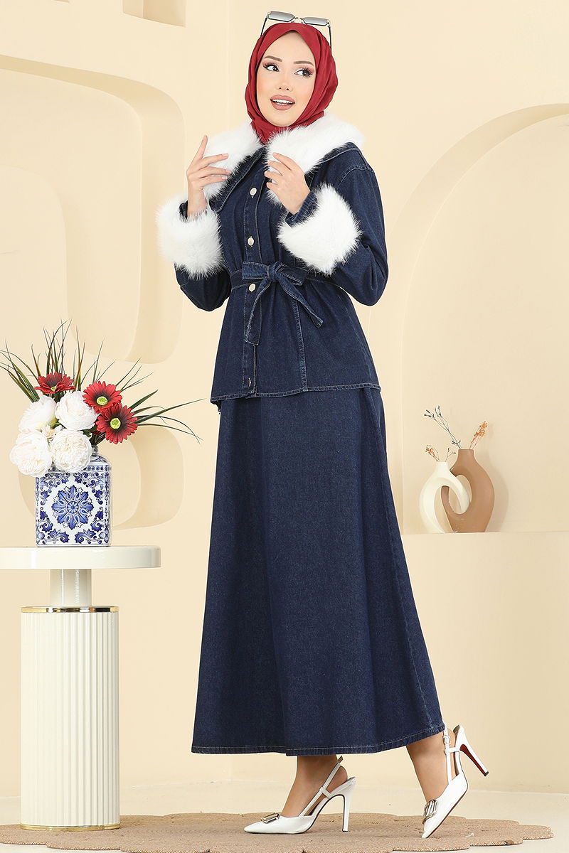 The model denim suit with fur accessories is designed specially for those considering modest attire and can be comfortably used in all seasons. This outfit, highlighted with fur details, is suitable for delicate wash at 30 degrees and should not be wrung during washing. Both the belt and the fur accessories are detachable, allowing for versatility in style. The product's elastic waistband provides freedom of movement, while its fur-cuffed jacket adds an extra touch of elegance. Choose from the available sizes to suit your needs.