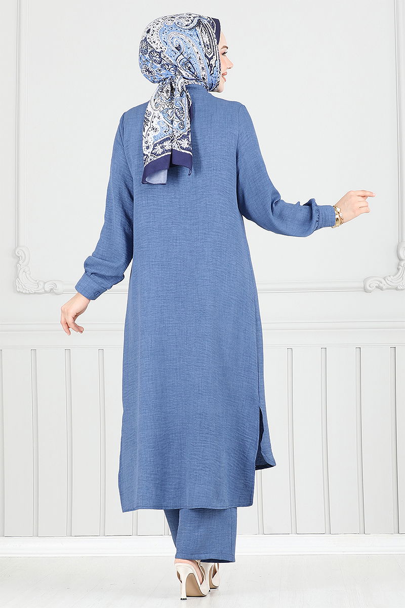 Embrace every season with the Slit Hijab Suit! This combination, suitable for all four seasons, provides day-long comfort with the lightness and comfort of Sofia linen fabric. With its 30-degree washable feature and delicate washing requirements, maintaining your chic look is effortless with its half stand-up collar and front-buttoned design. The side-slit tunic and elastic waist pants offer ease of movement, while the unlined structure ensures lightness. Complete your elegance with cuff buttons.