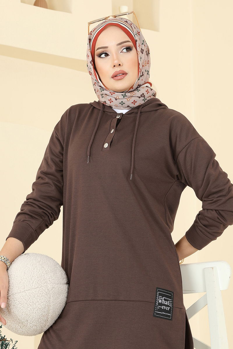 The Hooded Two-Yarn Set COMBO is a stylish modest wear suitable for all seasons. Made from dual thread fabric, this ensemble offers a practical and comfortable experience with its hooded neckline and half-button front. The model displayed in size M features detailed stitching and an elastic waistband on the trousers, ensuring comfort throughout the day. This combination, which includes both a tunic and trousers, will complete your daily outfit with elegance.