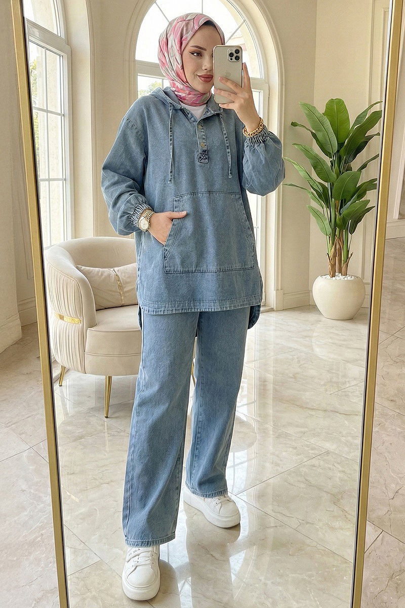 The Half Snap Denim Suit model is a modest fashion compatible suit that can be comfortably worn in all seasons. Washable in delicate mode at 30 degrees Celsius, this suit is made from durable denim fabric. It features a hooded neckline with snap details offering a modern look. Both the tunic and the pants have pockets, and the pants have an elastic waistband for comfortable wear. With elastic cuffs, this suit is ideal for those seeking a stylish yet comfortable style.
