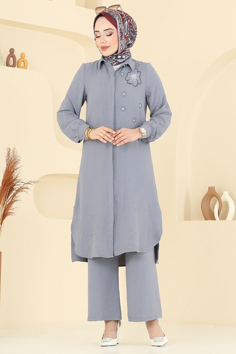 Product Feature : It is a new season hijab fashion product. The product has a Shirt collar. The product has Secret buttons. The tunic has a side slash.. Unlined. Embroidery details are sewn. The sequin detail is sewn. Blouse is not included. Sample combination is made with the blouse to show the intended use of the product. The waist of the trousers is elastic. Cuff buttons are active. There may be a tonal difference in the product due to concept photo shoots.