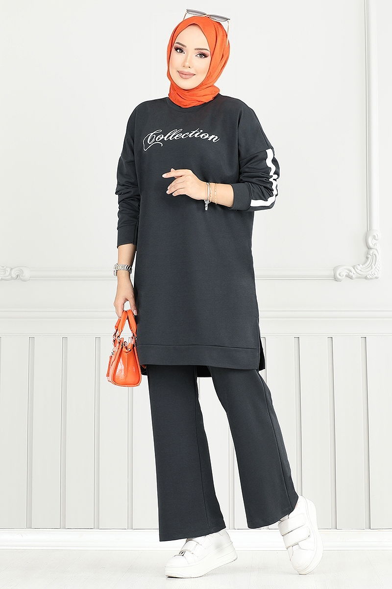 Product Feature : It is a new season hijab fashion product. The product is worn on the head. The product has a Cycling collar. The tunic has a side slash.. Unlined. The writings are in print. The waist of the trousers is elastic. There may be a tonal difference in the product due to concept photo shoots.