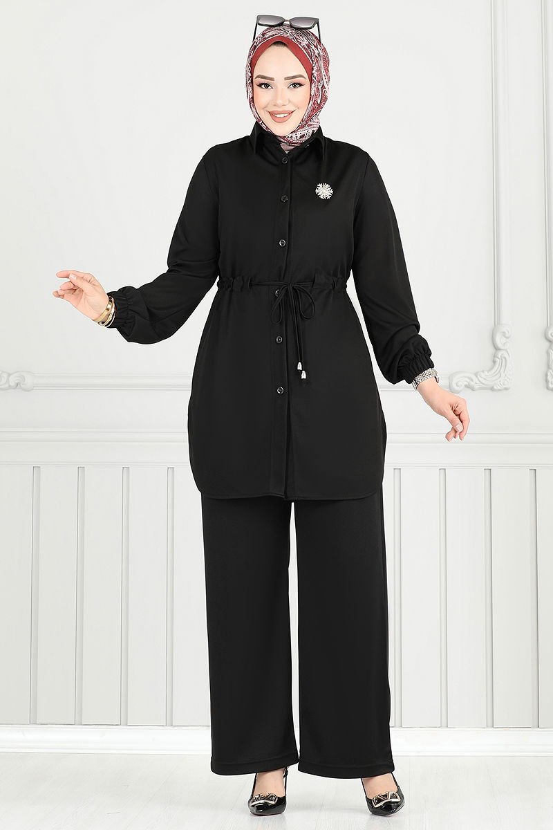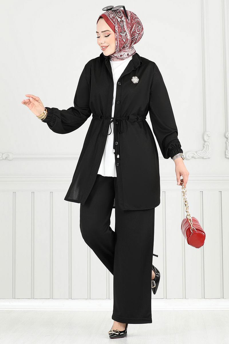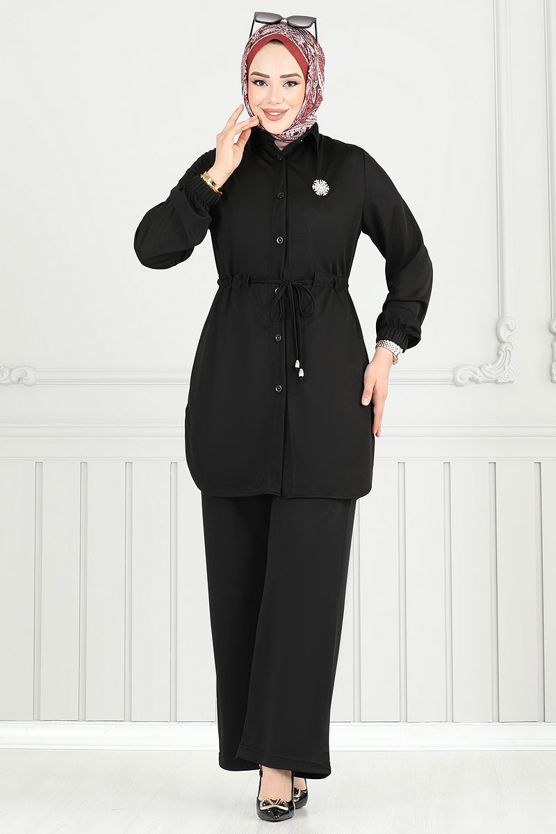 The Belted Tunnel Hijab Suit is a versatile outfit that can be comfortably worn in all seasons. It can be washed at 30 degrees on a gentle cycle. Made from Mira fabric, this product features a shirt collar and front buttons that make a statement. The tunic has stylish slits on the sides, with a drawstring waist and an elastic waistband for the trousers. The unlined design provides a light and comfortable wear. The product has elastic cuffs, and the model showcases a size 38.