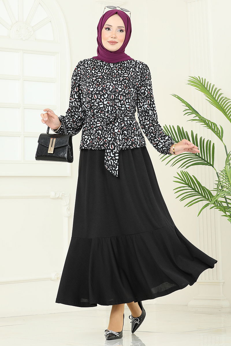 المنتج لديه ياقة دائرية. غير مبطنة. يتم خياطة الحزام على المنتج. .خصر التنورة مرن السوار مطاطي. قد يكون هناك اختلاف في الدرجة اللونية في المنتج بسبب التقاط الصور الفوتوغرافية.