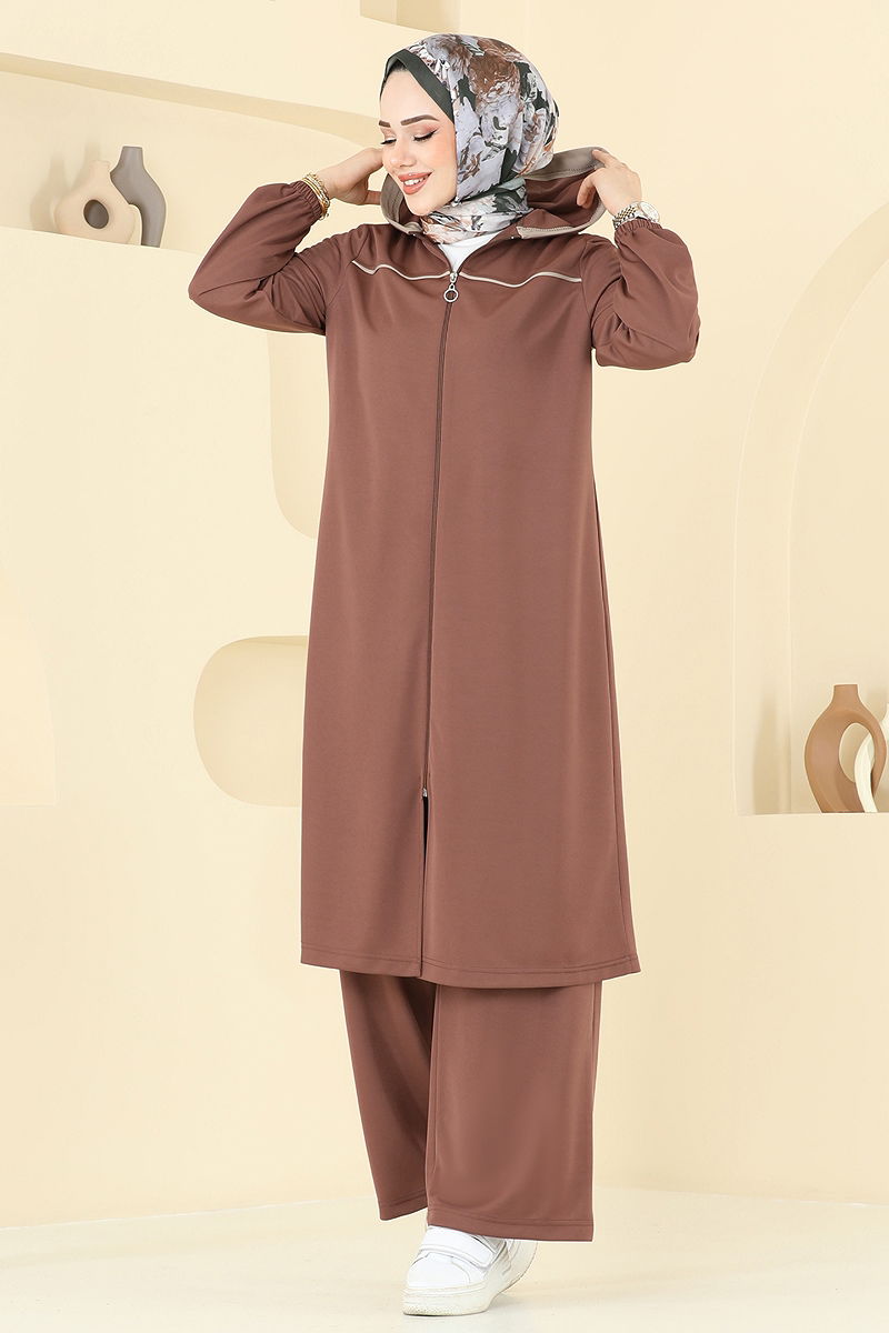 Product Feature : It is a new season hijab fashion product. The product has a Hooded collar. Unlined. The product has a zipper at the From the front part. The hood is sewn to the product. Blouse is not included. Sample combination is made with the blouse to show the intended use of the product. The waist of the trousers is elastic. The cuff is rubberized. There may be a tonal difference in the product due to concept photo shoots.