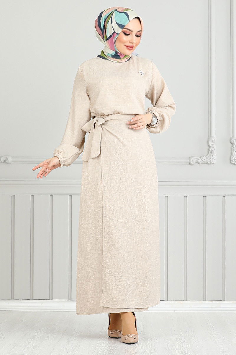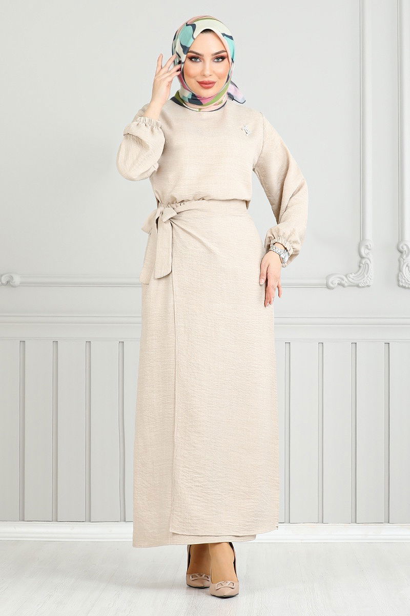 المنتج لديه ياقة دائرية. غير مبطنة. يتم خياطة الحزام على المنتج. يتم تضمين البروش،يمكن استخدامها حسب الرغبة تحتوي التنورة على حزام خصر مطاطي وأربطة. السوار مطاطي. قد يكون هناك اختلاف في الدرجة اللونية في المنتج بسبب التقاط الصور الفوتوغرافية.