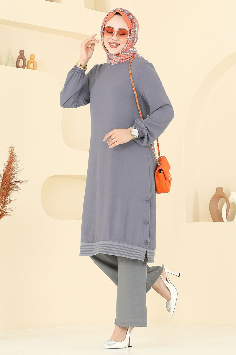 Slit Buttoned Aerobin Set is a specially designed modest wear combination perfect for all-season use. Recommended to be washed delicately at 30 degrees, this product is made from light and breathable aerobin fabric. Featuring a bicycle neckline, stylish side slits in the tunic, and a comfortable elastic waistband in the pants, it stands out with its functional design. The side buttons add an elegant touch as an accessory, making it an ideal choice for both daily wear and special occasions.
