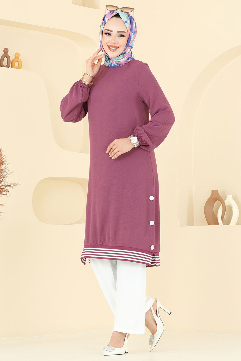 Slit Buttoned Aerobin Set is a specially designed modest wear combination perfect for all-season use. Recommended to be washed delicately at 30 degrees, this product is made from light and breathable aerobin fabric. Featuring a bicycle neckline, stylish side slits in the tunic, and a comfortable elastic waistband in the pants, it stands out with its functional design. The side buttons add an elegant touch as an accessory, making it an ideal choice for both daily wear and special occasions.