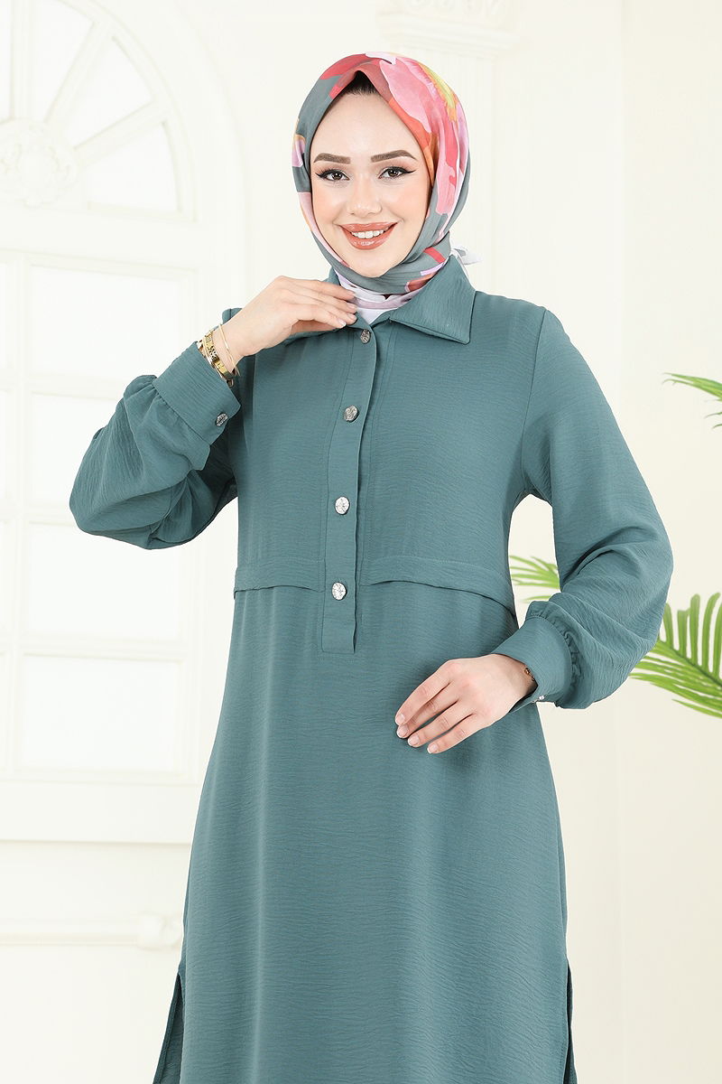 Product Feature : It is a new season hijab fashion product. The product has a Shirt collar. The product has half front buttons. The tunic has a side slash.. Unlined. Details are sewn. The waist of the trousers is elastic. Cuff buttons are active. There may be a tonal difference in the product due to concept photo shoots.