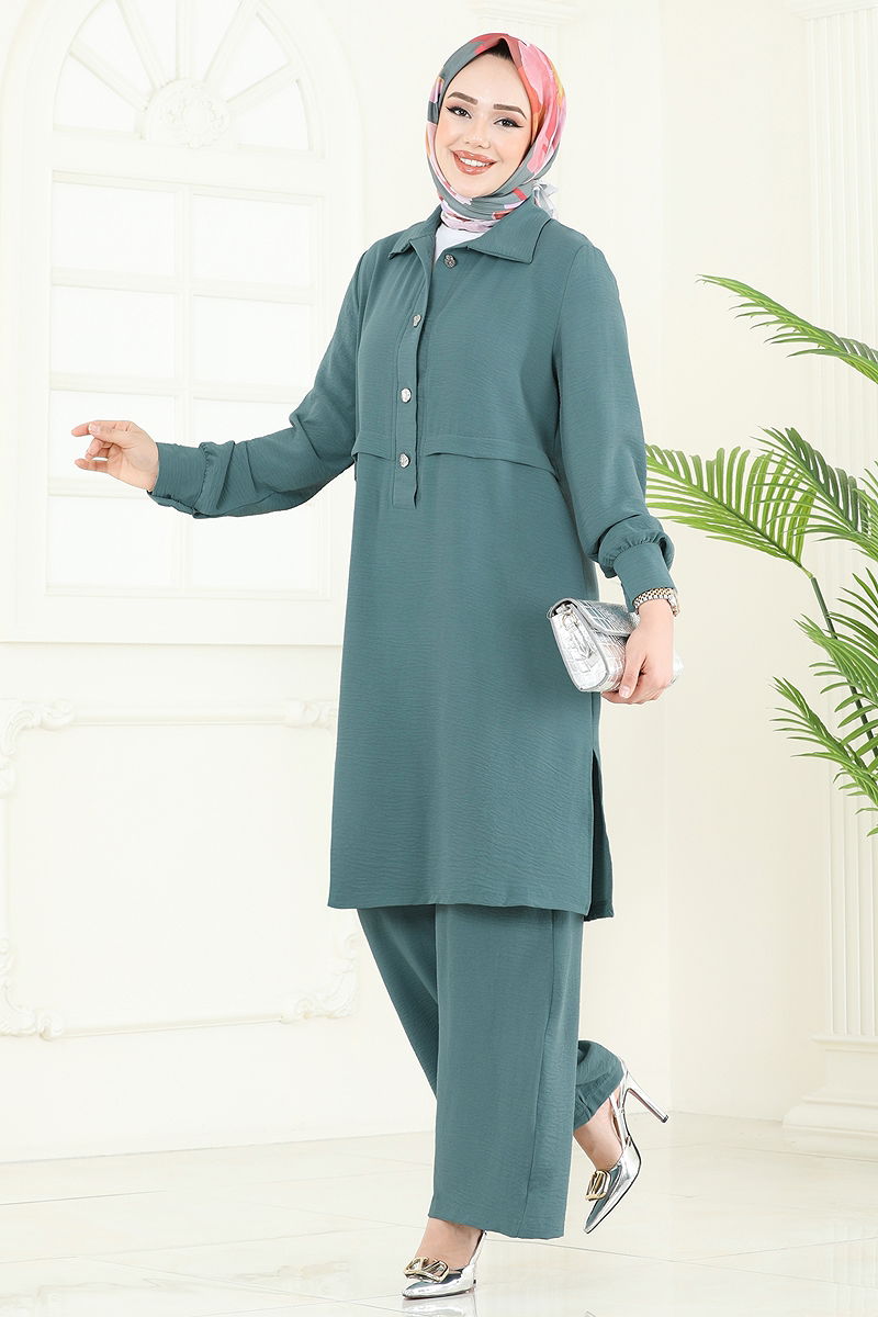المنتج لديه ياقة القميص. المنتج به أزرار نصف أمامي. البلوز تحتوي على فتحة. غير مبطنة. التفاصيل مخيطة. خصر البنطال مرن. أزرار الكفة نشطة. قد يكون هناك اختلاف في الدرجة اللونية في المنتج بسبب التقاط الصور الفوتوغرافية.