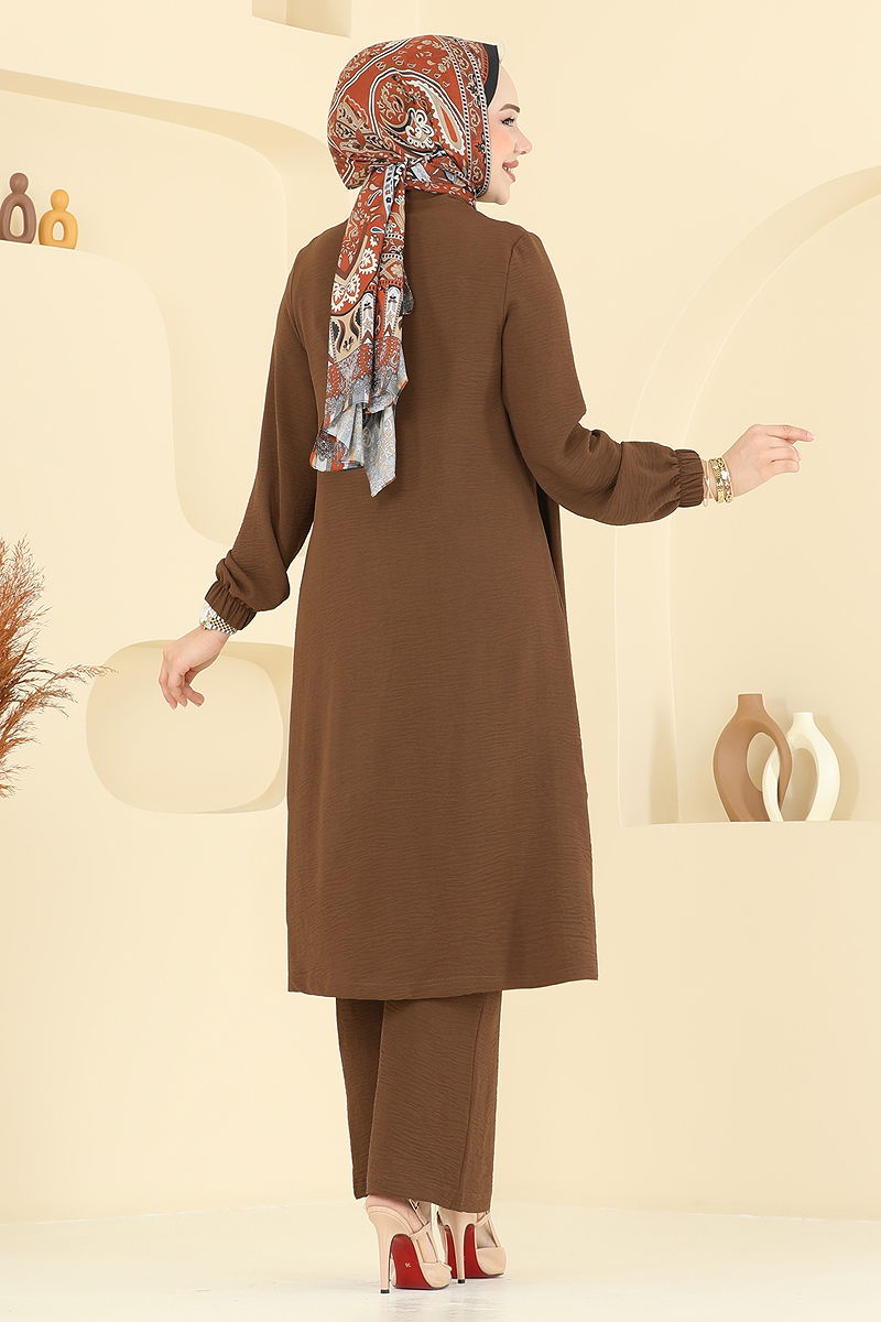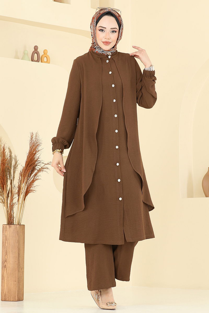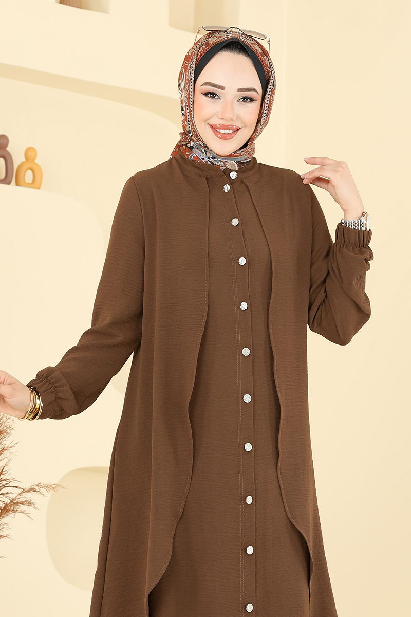 The Front Buttoned Aerobin Set merges innovative design with comfort, offering a versatile Islamic clothing option suitable for all seasons. Made from aerobin fabric that requires gentle washing at 30 degrees, this set features a demure stand-up collar and front button design that emphasizes elegance. The unlined structure ensures lightness while the elastic cuffs and waistband provide comfort. The blouse is not included and is used only for styling purposes. This outfit fits all standard sizes with its precise measurements.