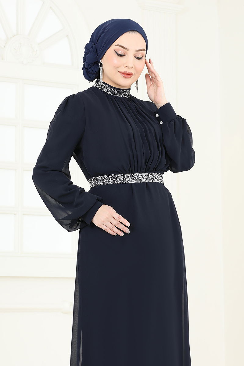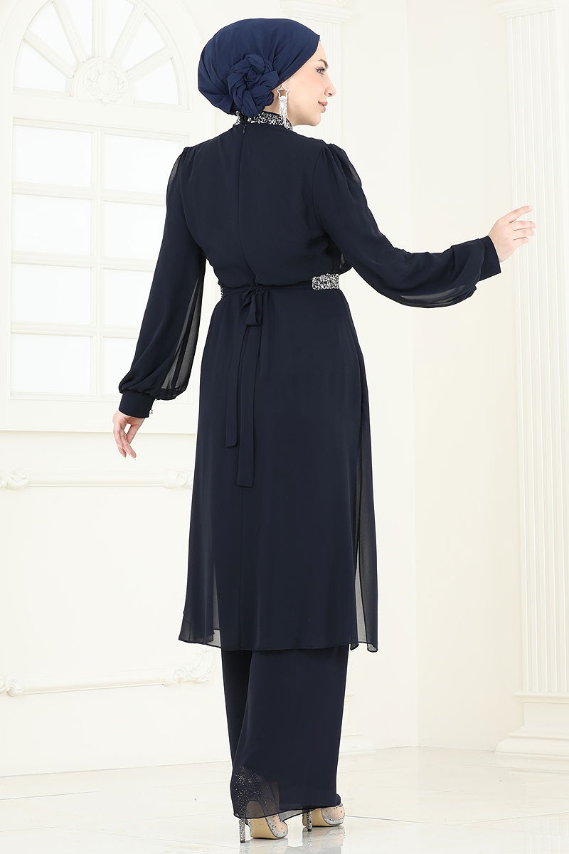 Exquisitely attractive, the Stone-Detailed Hijab Evening Suit is perfect to complement your elegance throughout all seasons. Made from chiffon, this ensemble features a high collar and a slit on the side of the tunic that captures attention. It has a zipper at the back for ease of use and lined for added comfort. The waistband of the pants is elastic, offering a snug fit. The suit comes with a stitched belt to prevent waving, which can be optionally removed. The cufflinks are functional; dry cleaning is recommended.