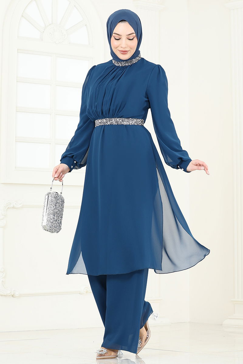 المنتج لديه ياقة بيضوية. البلوز تحتوي على فتحة. مبطنة. المنتج به سحاب في جزء من الخلف. يتم لصق الحجارة. الحزام متضمن، ،يمكن استخدامها حسب الرغبة خصر البنطال مرن. أزرار الكفة نشطة. قد يكون هناك اختلاف في الدرجة اللونية في المنتج بسبب التقاط الصور الفوتوغرافية.