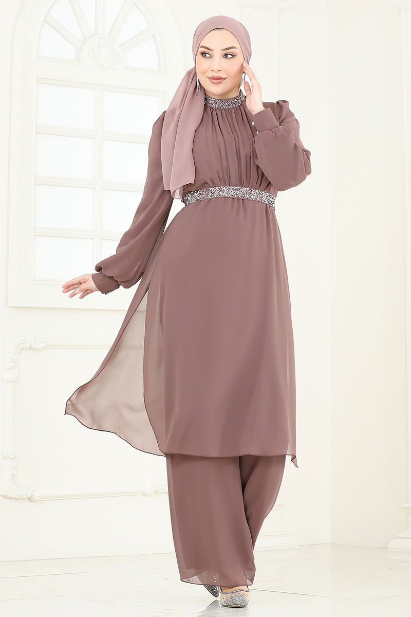 Product Feature : It is a new season hijab fashion product. The product has a Judge collar. The tunic has a side slash.. It is lined. The product has a zipper at the from the back part. The stones are glued. Belt included, optional not available. The waist of the trousers is elastic. Cuff buttons are active. There may be a tonal difference in the product due to concept photo shoots.
