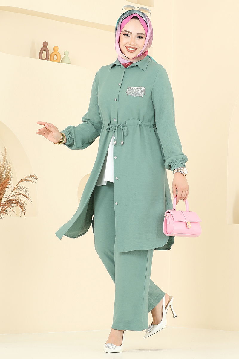 يتميز بخصر ذو أربطة. المنتج لديه ياقة القميص. المنتج به أزرار من الأمام. البلوز تحتوي على فتحة. غير مبطنة. يتم لصق الحجارة. خصر البنطال مرن. السوار مطاطي. قد يكون هناك اختلاف في الدرجة اللونية في المنتج بسبب التقاط الصور الفوتوغرافية.