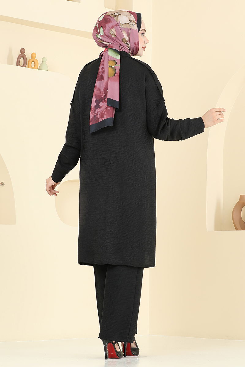 المنتج لديه ياقة نصف بيضوية. غير مبطنة. الكبسات مفعلة خصر البنطال مرن. قد يكون هناك اختلاف في الدرجة اللونية في المنتج بسبب التقاط الصور الفوتوغرافية.