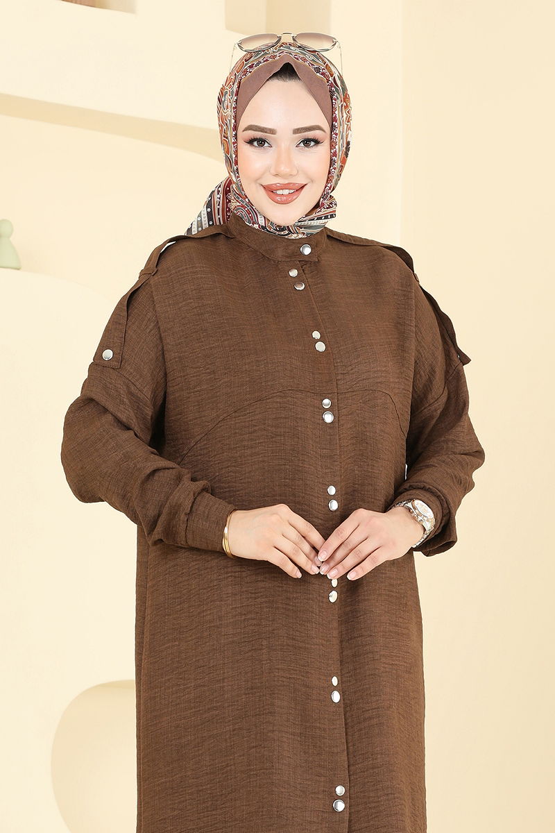 The Front Snapped Sofia Set, KOMBIN model, is a versatile hijab outfit suitable for all seasons. It can be washed at 30 degrees on a gentle cycle. Made of linen fabric, this product features a semi-mandarin collar and active snap details. The waist of the pants is elasticated, designed for enhanced comfort. It is unlined, comprising a stylish tunic and pants combination.