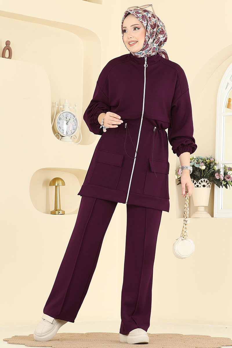 Elegant and comfortable, the Drawstring Waist Modal Suit brings sophistication to modest wear. Suitable for all seasons, this outfit is made from modal fabric and can be washed at 30 degrees with gentle care. It features a half-stand collar and a front zipper, offering a contemporary look. With its drawstring waist and elastic waistband on the trousers, this combination provides both comfort and style. The addition of pockets on both the cardigan and trousers enhances functionality, while elastic cuffs add to the comfort.