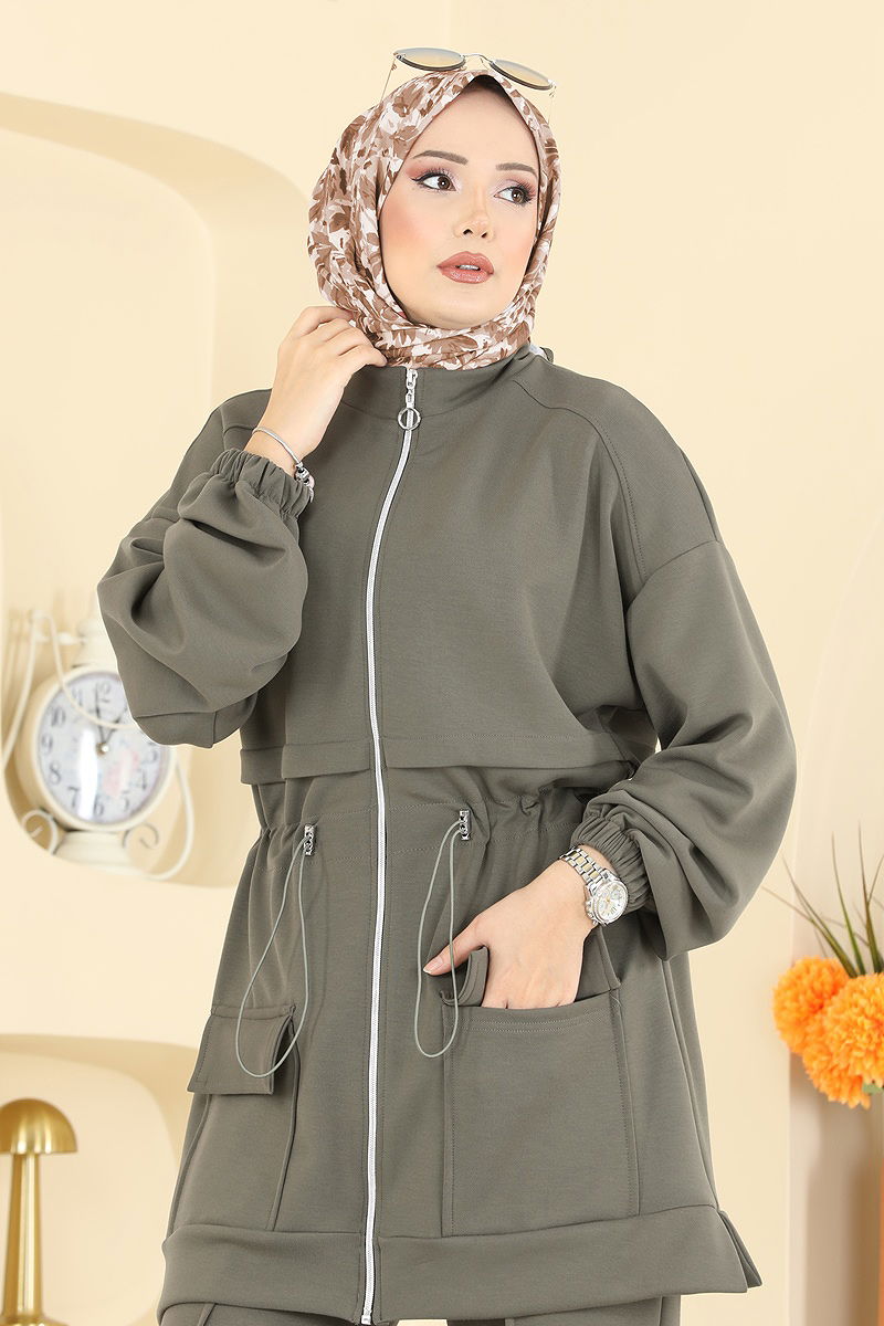 Product Feature : It is a new season hijab fashion product. It has a laced waist. The product has a Half Judge collar. Unlined. The product has a zipper at the From the front part. Pocket available. The waist of the trousers is elastic. The cuff is rubberized. There may be a tonal difference in the product due to concept photo shoots.