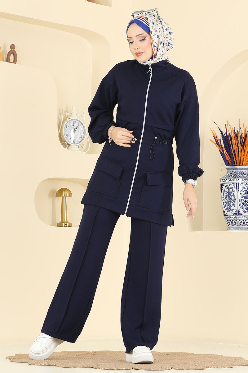 Elegant and comfortable, the Drawstring Waist Modal Suit brings sophistication to modest wear. Suitable for all seasons, this outfit is made from modal fabric and can be washed at 30 degrees with gentle care. It features a half-stand collar and a front zipper, offering a contemporary look. With its drawstring waist and elastic waistband on the trousers, this combination provides both comfort and style. The addition of pockets on both the cardigan and trousers enhances functionality, while elastic cuffs add to the comfort.