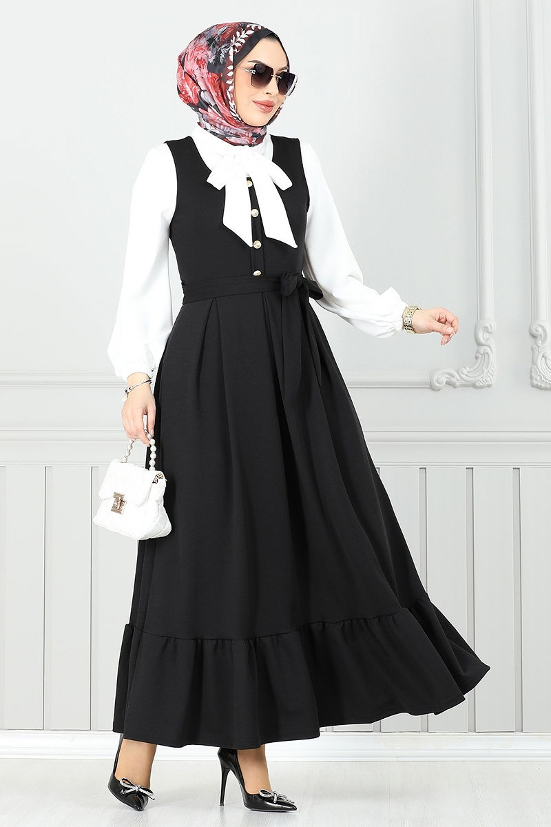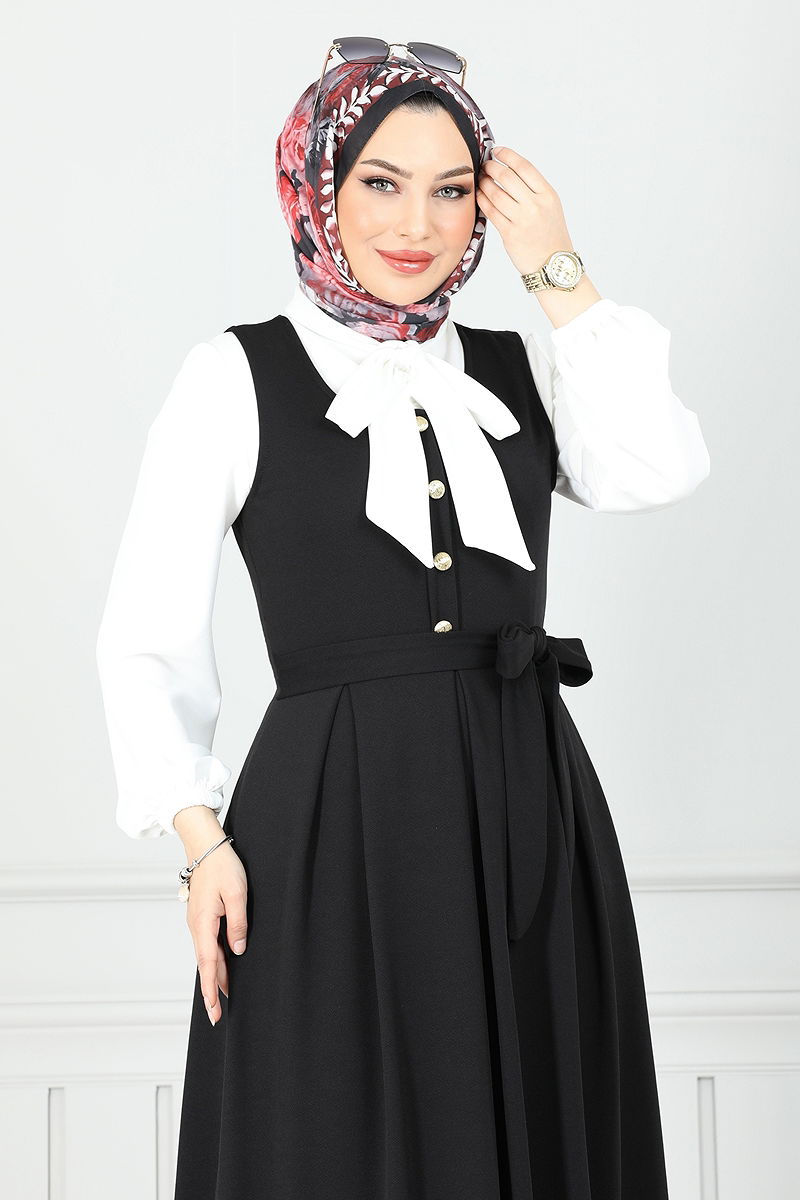Our Scarf Collared Shirt Jile model is a modest clothing item suitable for all seasons. Washable at 30 degrees for delicate fabrics, this product is made from crepe fabric. It features a scarf collar and button details to enhance your elegance. The product is unlined, and the belt is designed to add a sophisticated touch to your combination. The belt ends are fixed, with the middle part left unstitched and can be removed optionally. This jile and blouse combo with elastic cuffs is both stylish and comfortable.