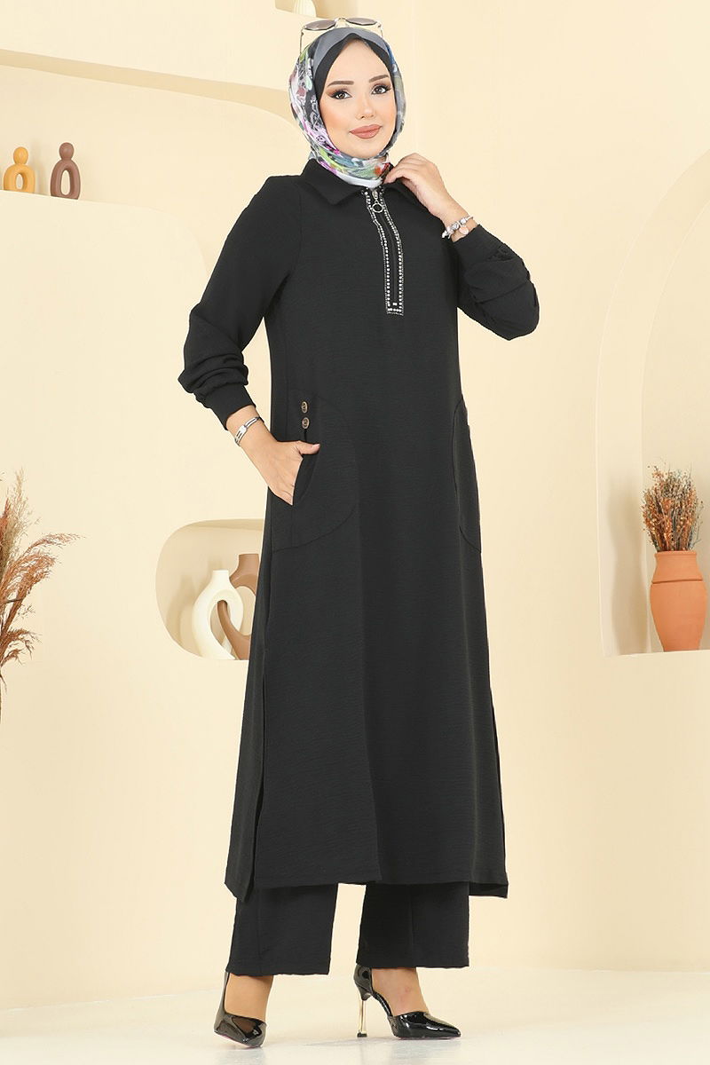 Product Feature : It is a new season hijab fashion product. There is a half zipper that can be used from the front. The product has a Shirt collar. The tunic has a side slash.. The stones are glued. The waist of the trousers is elastic. There may be a tonal difference in the product due to concept photo shoots.