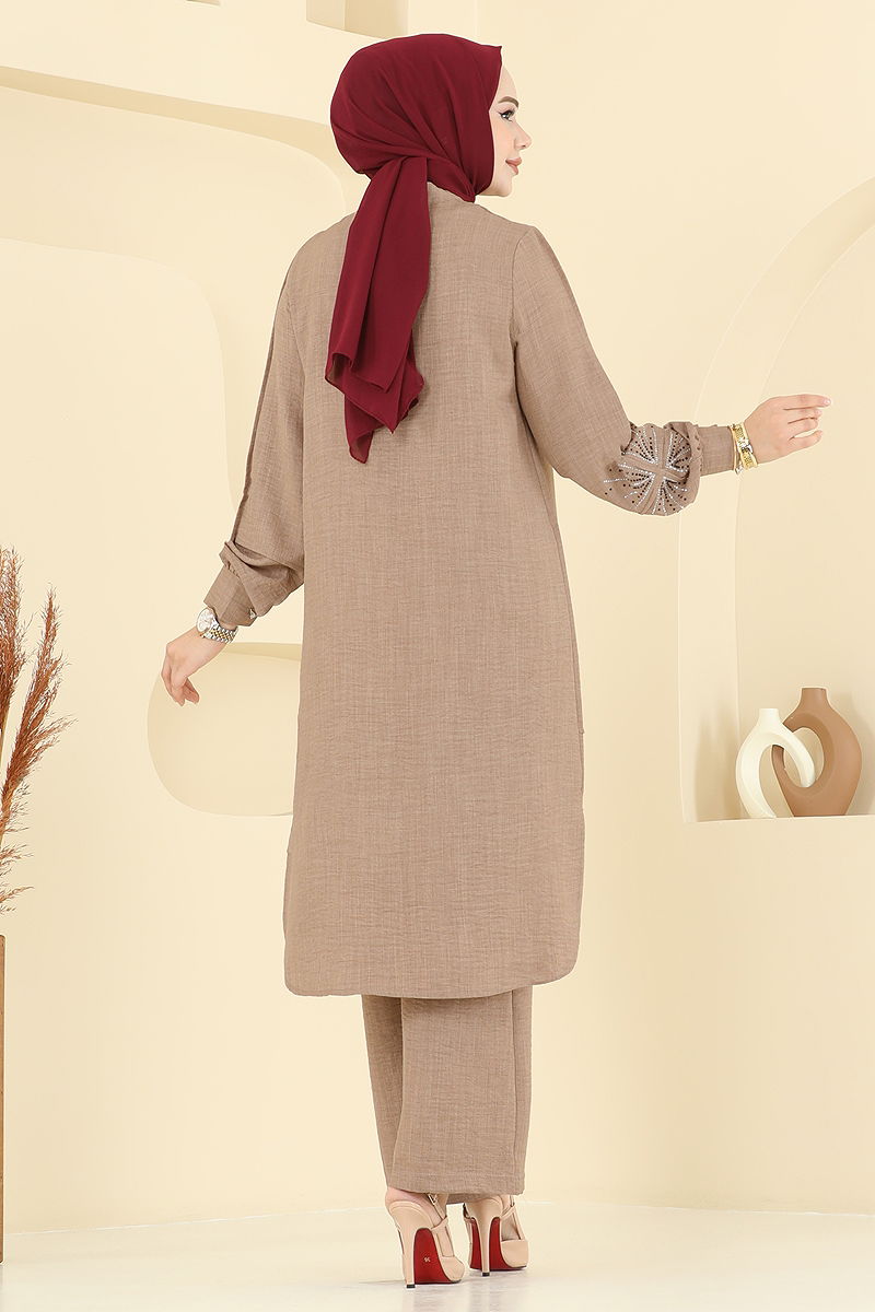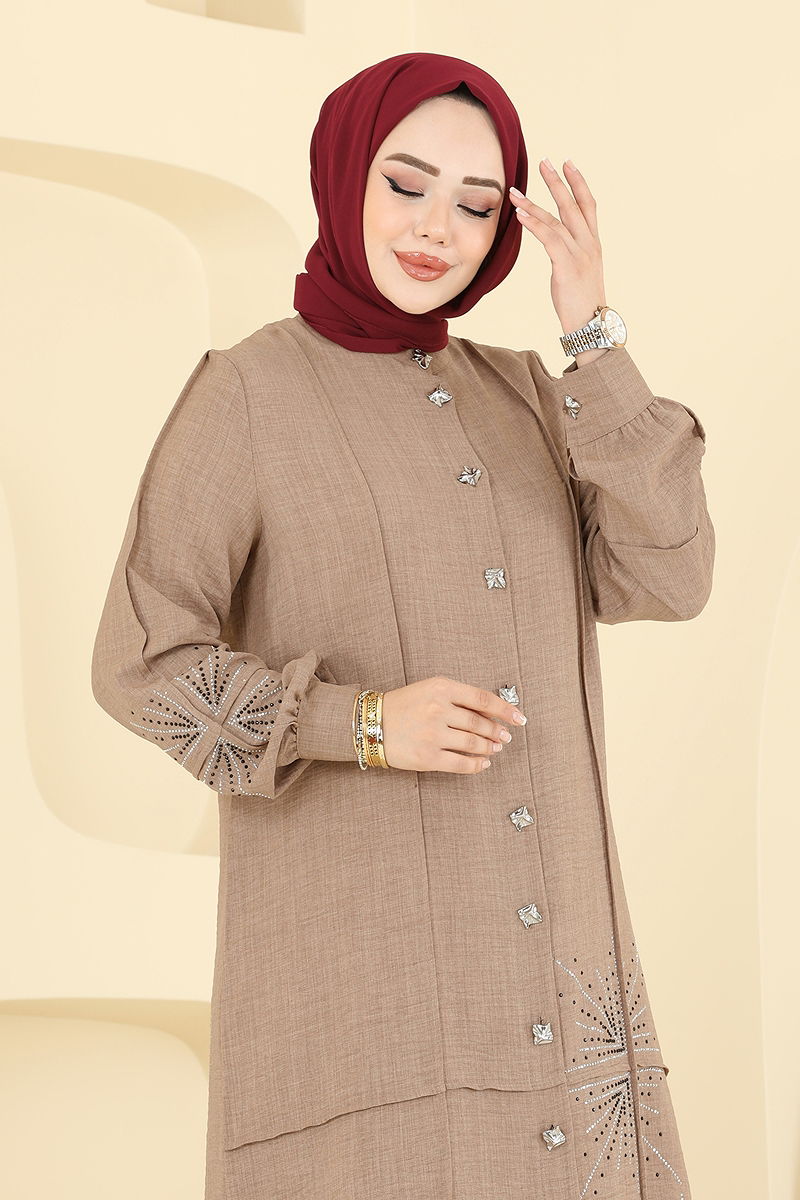 Product Feature : It is a new season hijab fashion product. The product has a Half Judge collar. The product has From the front buttons. The tunic has a side slash.. Unlined. The stones are glued. Cuff buttons are active. There may be a tonal difference in the product due to concept photo shoots.