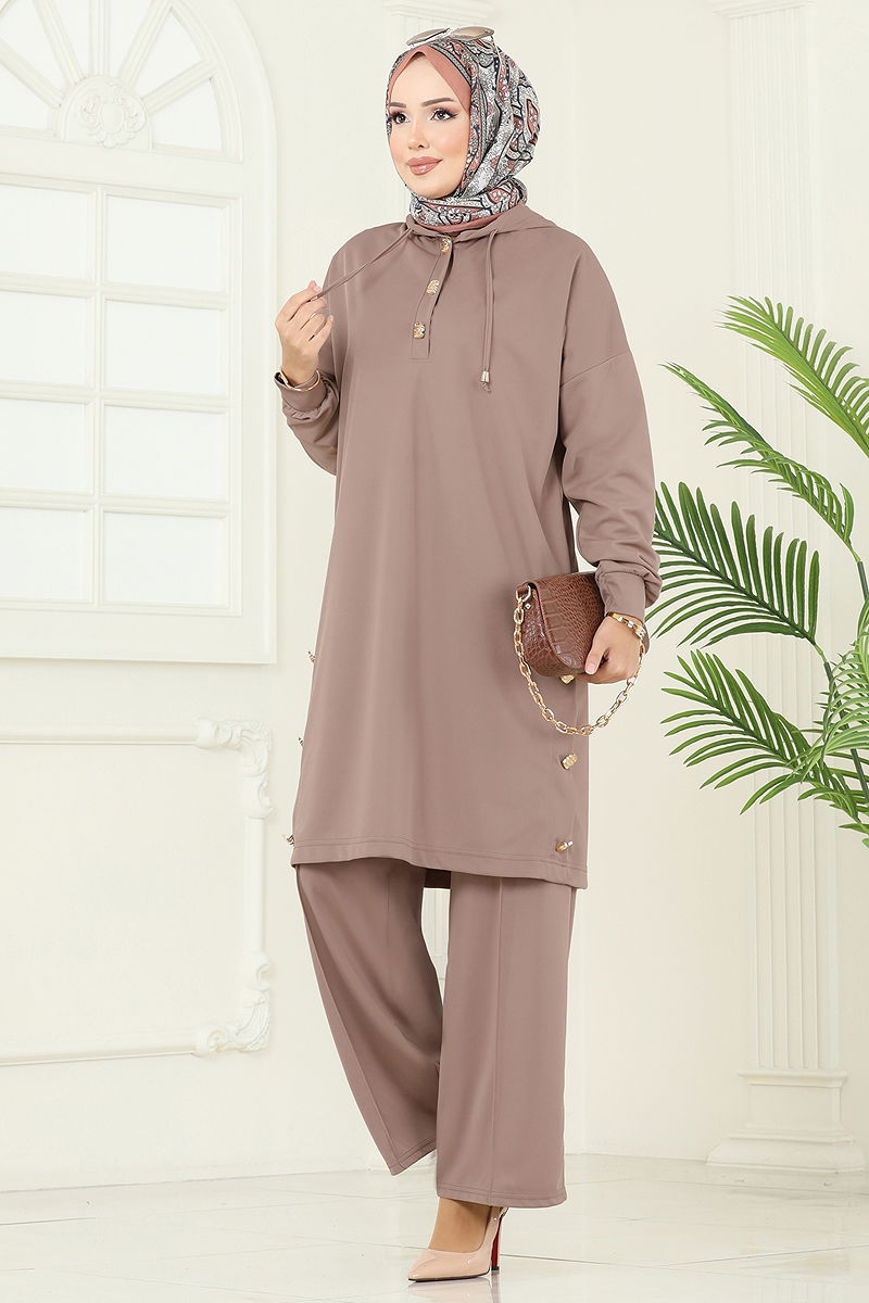 المنتج لديه ياقة مع قبعة. المنتج به أزرار نصف أمامي. الازرار الموجود بالفتحات اكسسوار. غير مبطنة. خصر البنطال مرن. قد يكون هناك اختلاف في الدرجة اللونية في المنتج بسبب التقاط الصور الفوتوغرافية.