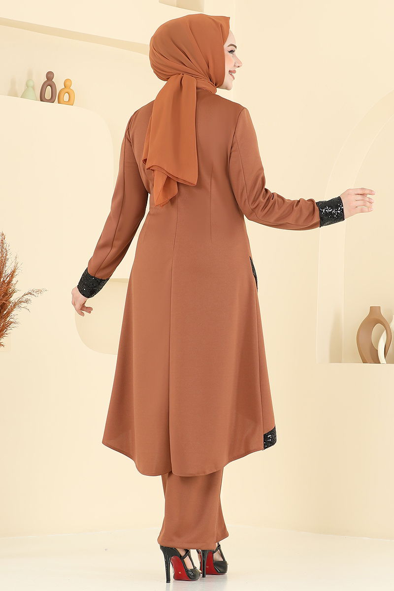 The Beaded Sequin Set with Necklace is a stylish and comfortable hijab clothing item. Suitable for all seasons, this set can be gently washed at 30 degrees. Made from Mira fabric, it features a crew neckline and is unlined. The product stands out with its zippered back and sewn sequin details. The included necklace can be optionally removed, and the trousers have an elastic waist. Available in various sizes to suit every woman's style needs.