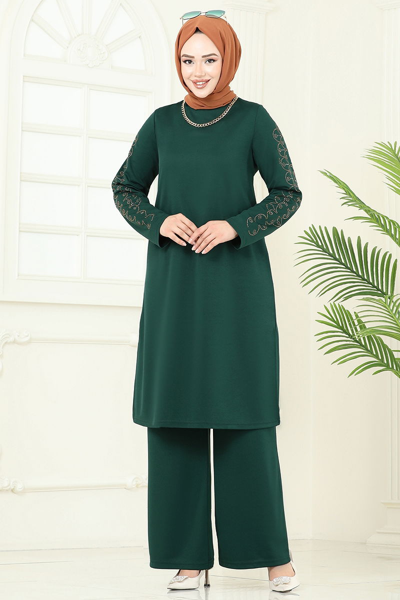 Featuring elegance and comfort together, the Stone Detailed Hijab Suit is designed for use in all seasons. It offers a long-lasting use with a recommendation of delicate wash at 30 degrees. Its Mira fabric provides comfort all day long. The suit perfectly combines a bike neck, side-slit tunic and elastic waist trousers. The stone details add a striking look, while its unlined structure guarantees lightness. The combination preserves your elegance throughout the seasons with its exquisite details.