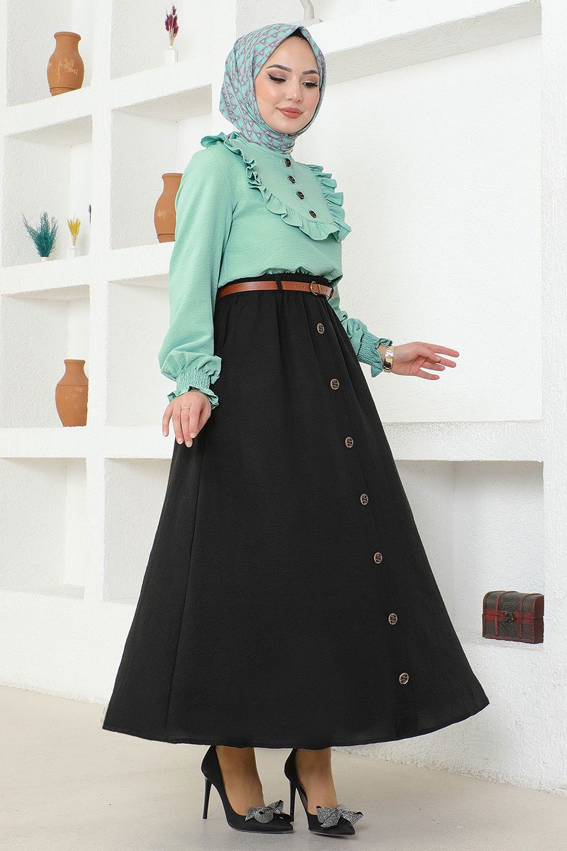 Product Feature :It is a new season hijab style product. (Unlined.)Cycling Collar.It has a functional buttons.Belt is included, can be used optionally.The cuff is rubberized and pleated.The waist of the skirt is elasticButtons are useableThere may be a tonal difference in the product color due to the concept shots.