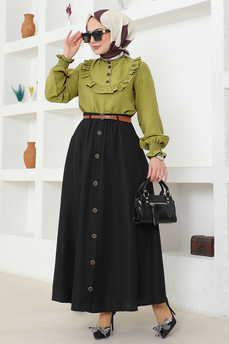 Product Feature :It is a new season hijab style product. (Unlined.)Cycling Collar.It has a functional buttons.Belt is included, can be used optionally.The cuff is rubberized and pleated.The waist of the skirt is elasticButtons are useableThere may be a tonal difference in the product color due to the concept shots.