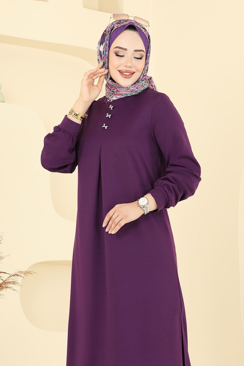 The Front Pleated Detail Suit TUNIC offers a blend of elegance and comfort. Suitable for all seasons, this modest wear piece is crafted from durable Mira fabric and can be washed at 30 degrees on a gentle cycle. Featuring a crew neck and side slits for a contemporary look, this tunic is unlined and adorned with decorative buttons. The product displayed on the model is size 38, available in various sizes to suit everyone.