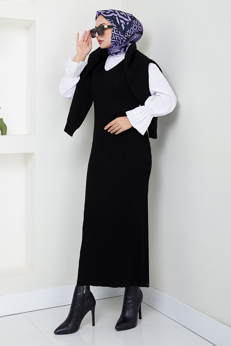 Button-detailed set KOMBİN model is a hijab product. It can be used in the Autumn and Winter seasons. It should be washed at 30 degrees without squeezing. It is made of first-class Knit fabric. The product has a bicycle collar and it is buttoned from the front. It is unlined. (The product on the model is standard size.) BLUZ and Dress