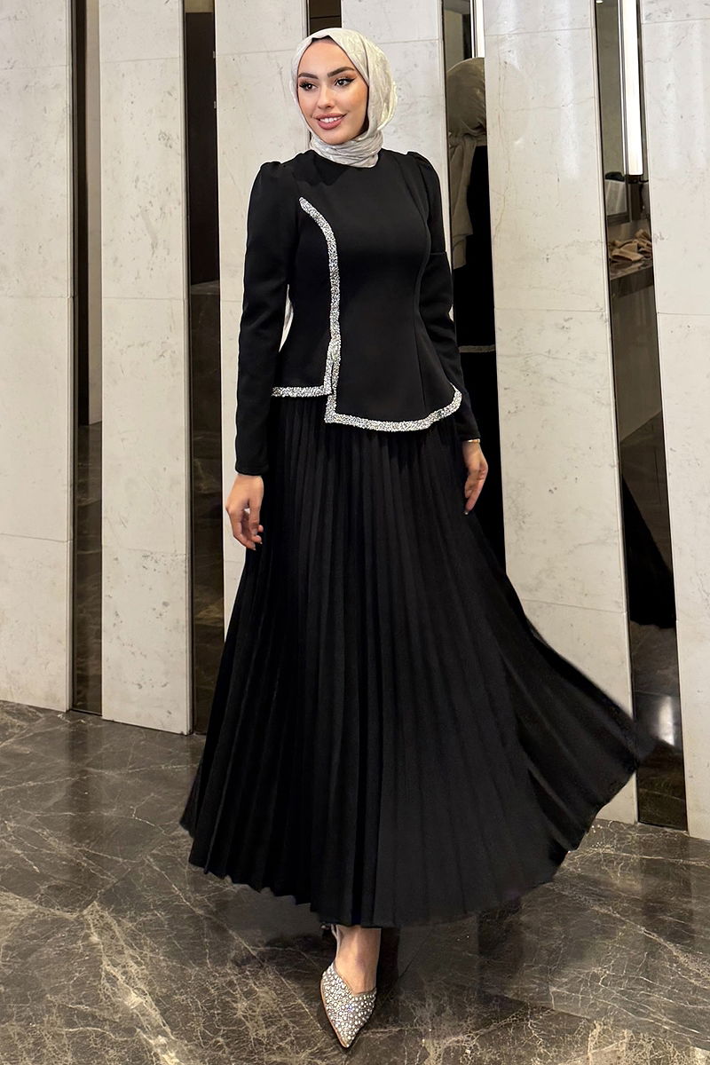 Product Feature : It is a new season hijab fashion product. The product has a Cycling collar. Unlined. The product has a zipper at the from the back part. The stones are glued. The skirt has a back zipper at the waist. There may be a tonal difference in the product due to concept photo shoots.
