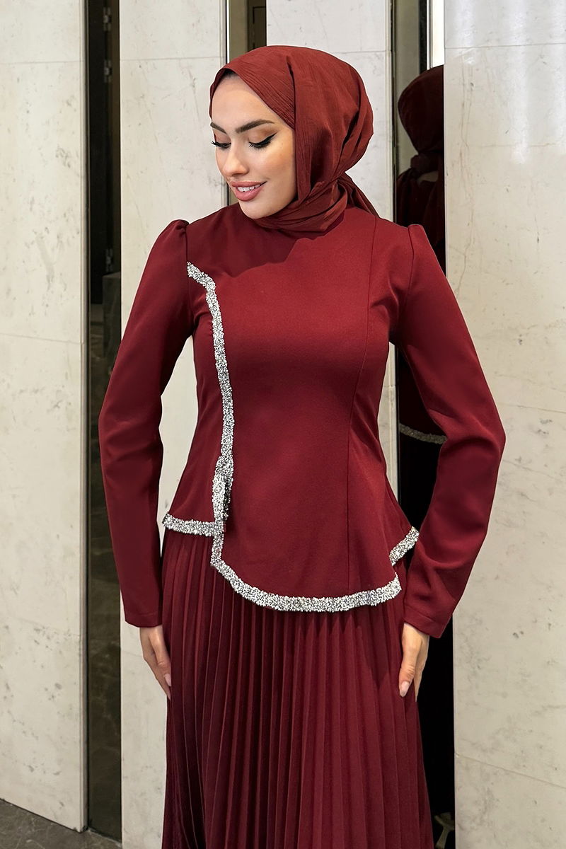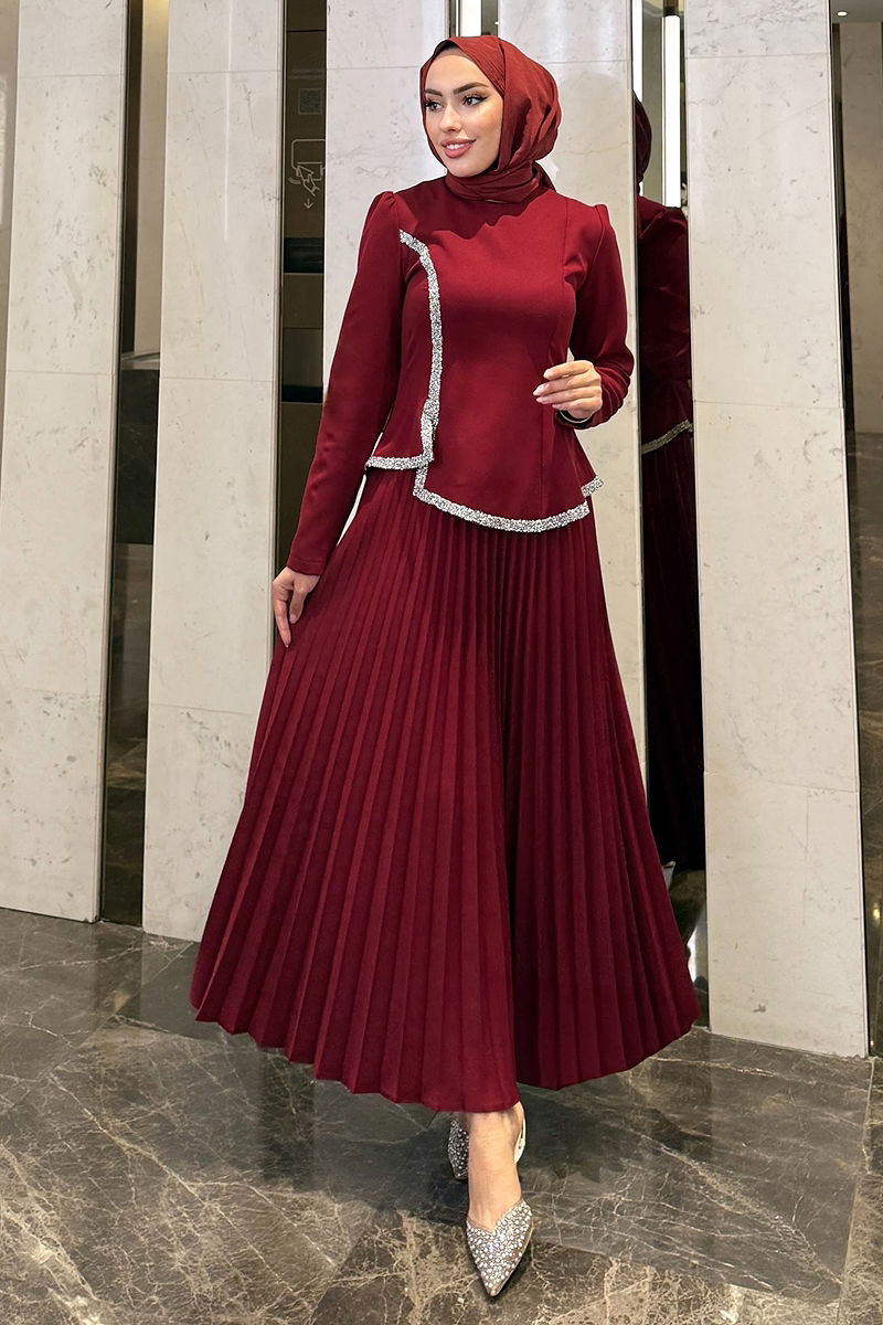 Product Feature : It is a new season hijab fashion product. The product has a Cycling collar. Unlined. The product has a zipper at the from the back part. The stones are glued. The skirt has a back zipper at the waist. There may be a tonal difference in the product due to concept photo shoots.